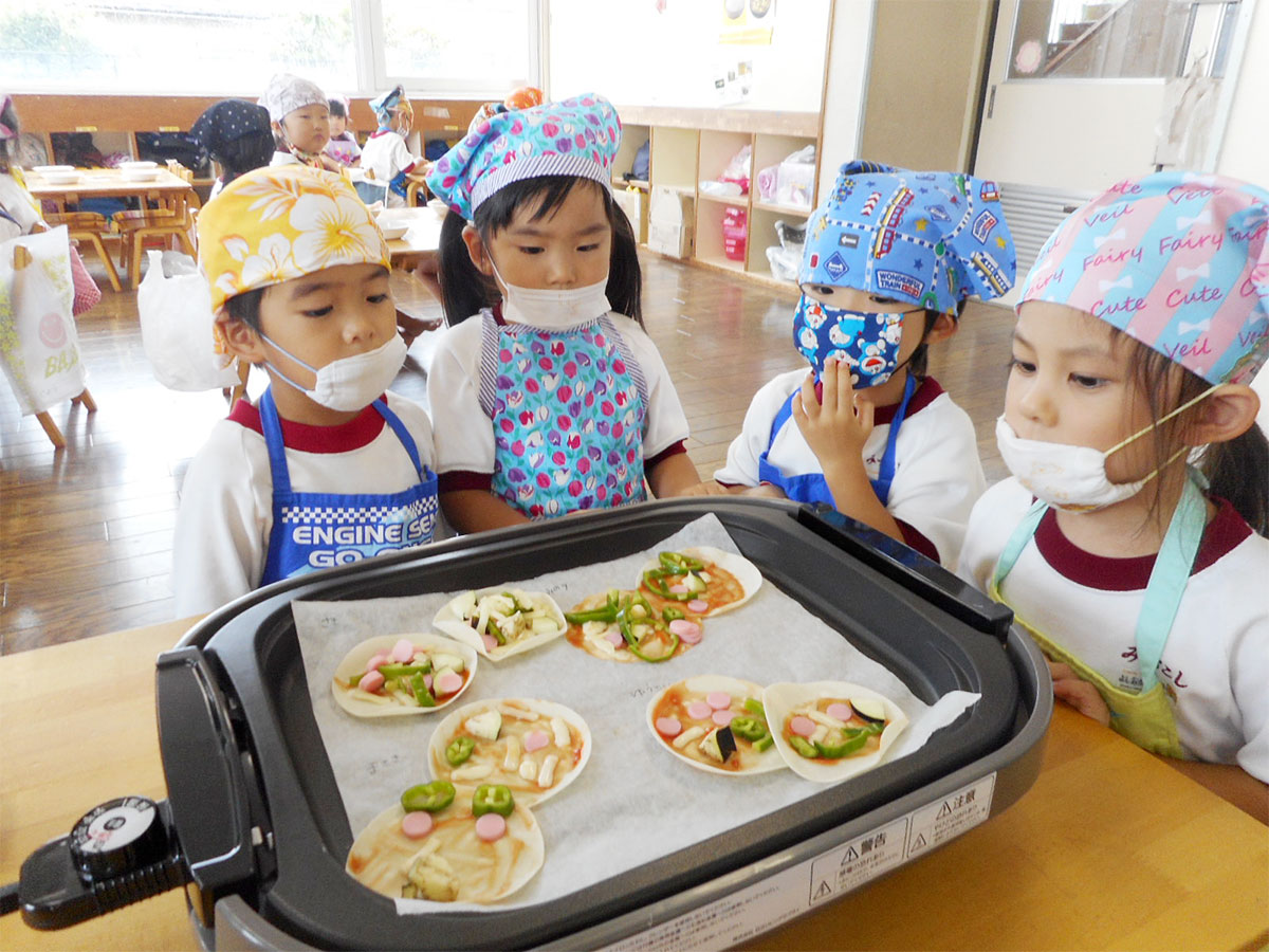 みづこしこども園では、毎日の「おいしいね」を大切にしながら食育に取り組んでいます。味覚・視覚・嗅覚・聴覚・触覚の五感を使って味わい、生活やあそびの中でも五感を働かせて活動し、生涯にわたって役立つ力へと結びつけていくよう取り組んでいます。特に食育は園全体で取り組んでいて、職員が子どもと一緒に計画を立てて年齢ごとに目標を設け、会議で話し合う事で共通理解を図っています。